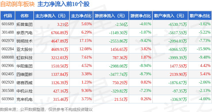 从资金流向上来看,当日自动刹车板块主力资金净流入1.63亿元,游资资金净流出3.14亿元,散户资金净流入1.51亿元。自动刹车板块个股资金流向见下表: