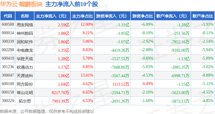 从资金流向上来看,当日华为云·鲲鹏板块主力资金净流入9.57亿元,游资资金净流出15.42亿元,散户资金净流入5.85亿元。华为云·鲲鹏板块个股资金流向见下表: