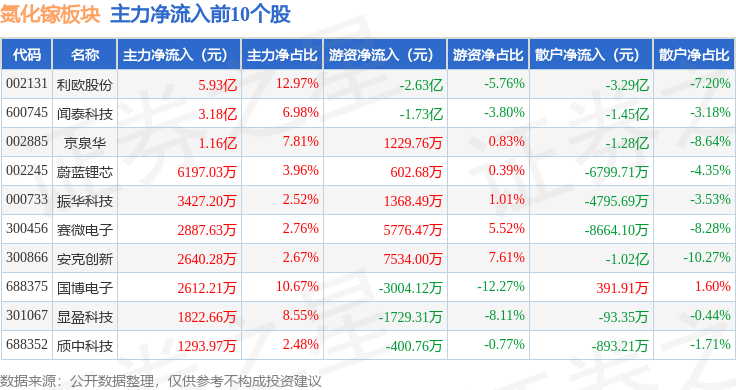 从资金流向上来看,当日氮化镓板块主力资金净流出71.91亿元,游资资金净流入26.64亿元,散户资金净流入45.27亿元。氮化镓板块个股资金流向见下表: