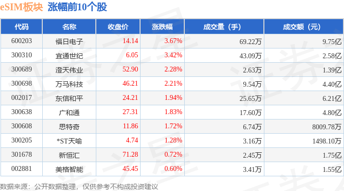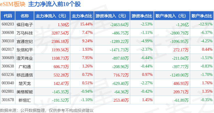 从资金流向上来看,当日eSIM板块主力资金净流出7967.6万元,游资资金净流入9277.62万元,散户资金净流出1310.03万元。eSIM板块个股资金流向见下表: