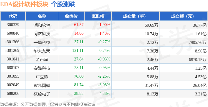 证券之星消息,10月31日EDA设计软件板块较上一交易日下跌1.39%,概伦电子领跌。当日上证指数报收于3954.79,下跌0.81%。深证成指报收于13378.21,下跌1.14%。EDA设计软件板块个股涨跌见下表: