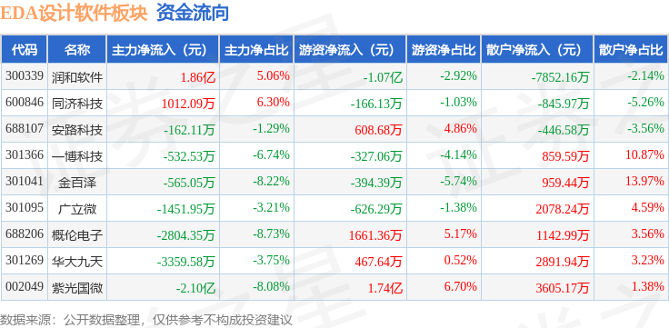从资金流向上来看,当日EDA设计软件板块主力资金净流出1.03亿元,游资资金净流入7915.97万元,散户资金净流入2392.66万元。EDA设计软件板块个股资金流向见下表: