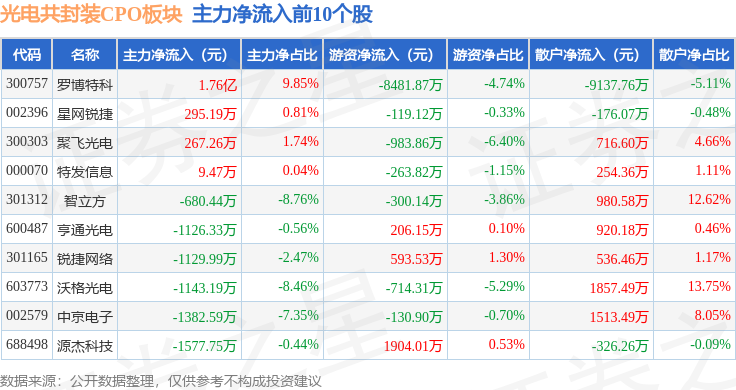 从资金流向上来看,当日光电共封装CPO板块主力资金净流出120.64亿元,游资资金净流入46.86亿元,散户资金净流入73.78亿元。光电共封装CPO板块个股资金流向见下表: