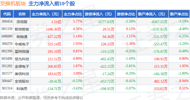 从资金流向上来看,当日交换机板块主力资金净流出44.2亿元,游资资金净流入9.01亿元,散户资金净流入35.2亿元。交换机板块个股资金流向见下表: