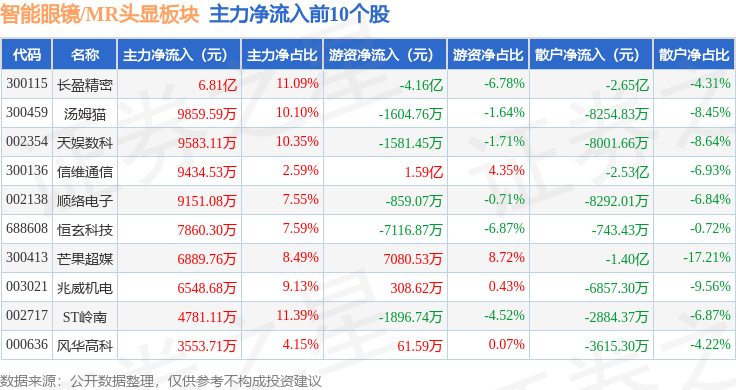 从资金流向上来看,当日智能眼镜/MR头显板块主力资金净流出102.78亿元,游资资金净流入32.78亿元,散户资金净流入70.0亿元。智能眼镜/MR头显板块个股资金流向见下表: