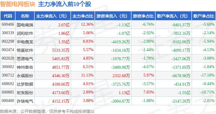 从资金流向上来看,当日智能电网板块主力资金净流出42.47亿元,游资资金净流入1.71亿元,散户资金净流入40.76亿元。智能电网板块个股资金流向见下表: