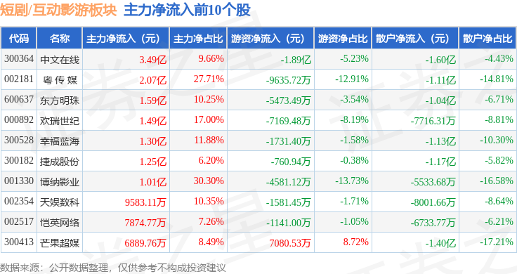 从资金流向上来看,当日短剧/互动影游板块主力资金净流入15.72亿元,游资资金净流出7.63亿元,散户资金净流出8.1亿元。短剧/互动影游板块个股资金流向见下表: