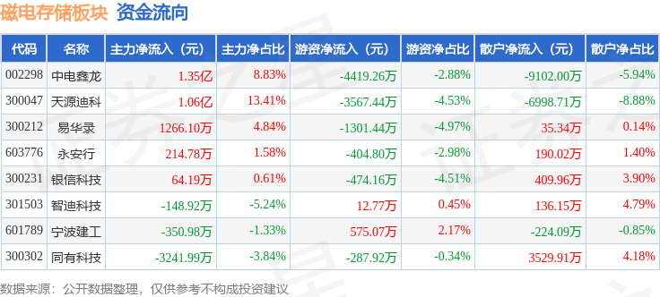 从资金流向上来看,当日磁电存储板块主力资金净流入2.19亿元,游资资金净流出9867.18万元,散户资金净流出1.2亿元。磁电存储板块个股资金流向见下表: