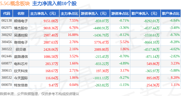 从资金流向上来看,当日5.5G概念板块主力资金净流出13.37亿元,游资资金净流入5.32亿元,散户资金净流入8.06亿元。5.5G概念板块个股资金流向见下表: