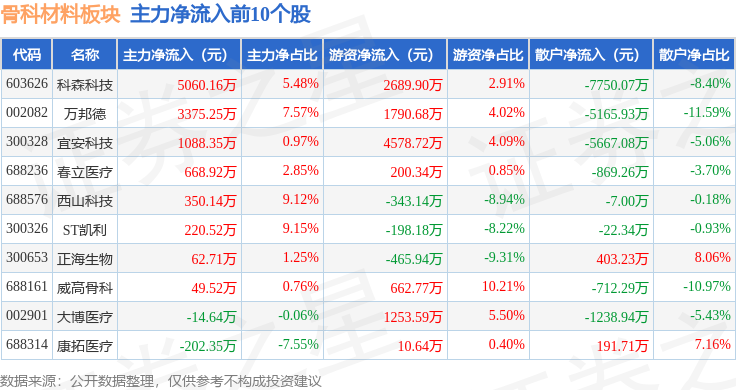 从资金流向上来看,当日骨科材料板块主力资金净流入2989.55万元,游资资金净流入8579.52万元,散户资金净流出1.16亿元。骨科材料板块个股资金流向见下表: