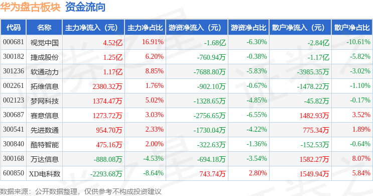 从资金流向上来看,当日华为盘古板块主力资金净流入7.26亿元,游资资金净流出3.23亿元,散户资金净流出4.03亿元。华为盘古板块个股资金流向见下表: