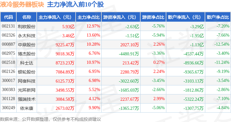 从资金流向上来看,当日液冷服务器板块主力资金净流出74.92亿元,游资资金净流入20.89亿元,散户资金净流入54.03亿元。液冷服务器板块个股资金流向见下表: