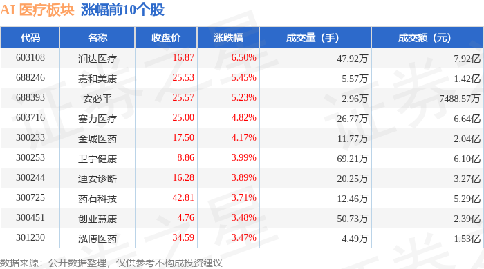 从资金流向上来看,当日AI 医疗板块主力资金净流入3.78亿元,游资资金净流出3.19亿元,散户资金净流出5929.66万元。AI 医疗板块个股资金流向见下表: