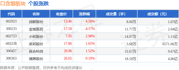 证券之星消息,10月31日口含烟板块较上一交易日上涨1.79%,润都股份领涨。当日上证指数报收于3954.79,下跌0.81%。深证成指报收于13378.21,下跌1.14%。口含烟板块个股涨跌见下表: