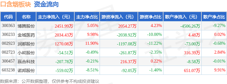 从资金流向上来看,当日口含烟板块主力资金净流入4935.18万元,游资资金净流出1319.29万元,散户资金净流出3615.9万元。口含烟板块个股资金流向见下表: