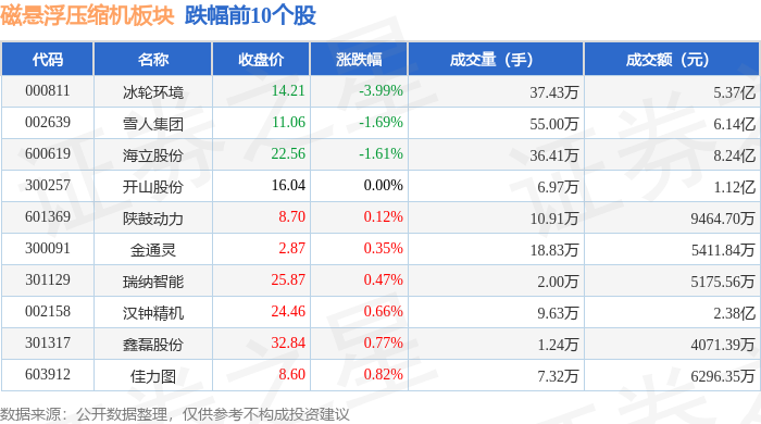 证券之星消息,10月31日磁悬浮压缩机板块较上一交易日下跌0.65%,冰轮环境领跌。当日上证指数报收于3954.79,下跌0.81%。深证成指报收于13378.21,下跌1.14%。磁悬浮压缩机板块个股涨跌见下表: