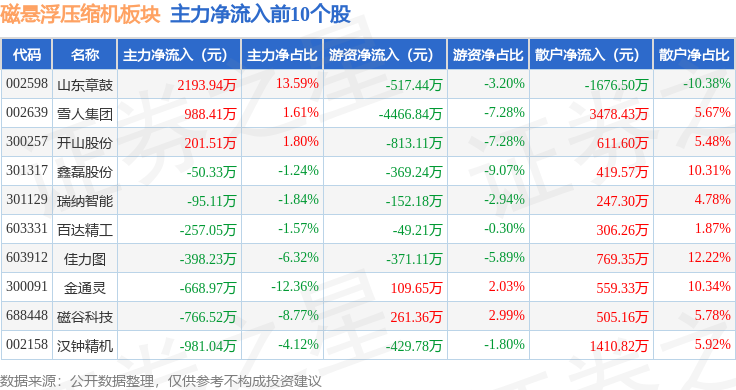 从资金流向上来看,当日磁悬浮压缩机板块主力资金净流出1.35亿元,游资资金净流出2529.1万元,散户资金净流入1.6亿元。磁悬浮压缩机板块个股资金流向见下表: