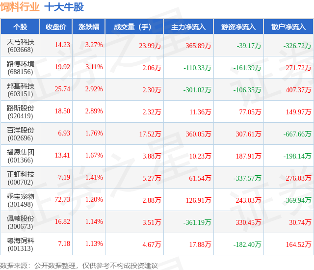个股表现方面,饲料行业当日领涨股为天马科技(603668),该股当日报收14.23,上涨3.27%,成交量23.99万,主力资金净流入365.89万元。路德环境(688156)以上涨3.11%紧随其后,该股当日成交量2.06万,主力资金净流出110.33万元。除此之外,邦基科技(603151)、路斯股份(920419)、百洋股份(002696)均进入当日牛股之列。具体个股列表见下表: