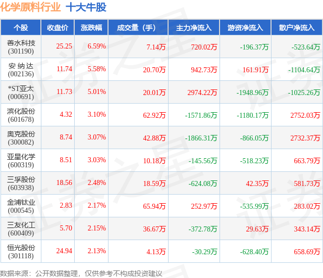 个股表现方面,化学原料行业当日领涨股为善水科技(301190),该股当日报收25.25,上涨6.59%,成交量7.14万,主力资金净流入720.02万元。安 纳 达(002136)以上涨5.58%紧随其后,该股当日成交量20.7万,主力资金净流入942.73万元。除此之外,*ST亚太(000691)、滨化股份(601678)、奥克股份(300082)均进入当日牛股之列。具体个股列表见下表: