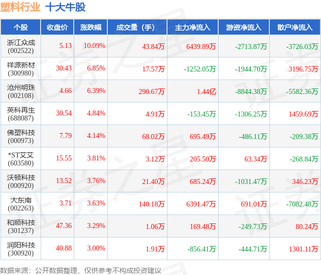 个股表现方面,塑料行业当日领涨股为浙江众成(002522),该股当日报收5.13,上涨10.09%,成交量43.84万,主力资金净流入6439.89万元。祥源新材(300980)以上涨6.85%紧随其后,该股当日成交量17.57万,主力资金净流出1252.05万元。除此之外,沧州明珠(002108)、英科再生(688087)、佛塑科技(000973)均进入当日牛股之列。具体个股列表见下表: