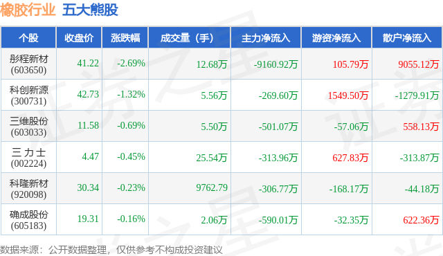 个股表现方面,橡胶行业当日领跌股为彤程新材(603650),该股当日报收41.22,下跌2.69%,成交量12.68万,主力资金净流出9160.92万元。科创新源(300731)以下跌1.32%紧随其后,该股当日成交量5.56万,主力资金净流出269.6万元。除此之外,三维股份(603033)、三 力 士(002224)、科隆新材(920098)均进入当日熊股之列。具体个股列表见下表: