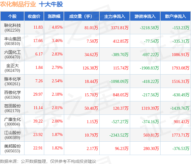 个股表现方面,农化制品行业当日领涨股为联化科技(002250),该股当日报收11.83,上涨4.05%,成交量81.01万,主力资金净流入3371.81万元。丰山集团(603810)以上涨3.46%紧随其后,该股当日成交量7.5万,主力资金净流入412.85万元。除此之外,六国化工(600470)、金正大(002470)、雅本化学(300261)均进入当日牛股之列。具体个股列表见下表: