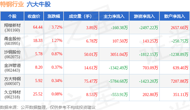 个股表现方面,特钢行业当日领涨股为翔楼新材(301160),该股当日报收64.44,上涨3.72%,成交量3.89万,主力资金净流出160.38万元。甬金股份(603995)以上涨1.27%紧随其后,该股当日成交量6.78万,主力资金净流入107.5万元。除此之外,沙钢股份(002075)、金洲管道(002443)、方大特钢(600507)均进入当日牛股之列。具体个股列表见下表: