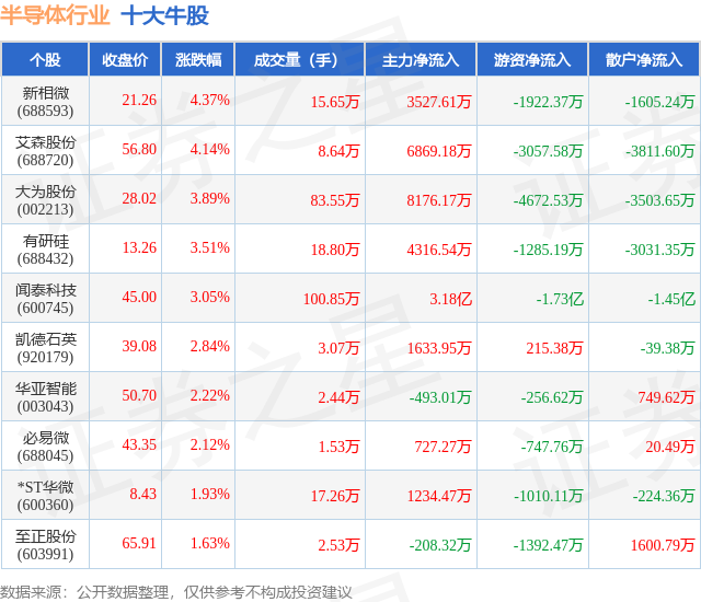 个股表现方面,半导体行业当日领涨股为新相微(688593),该股当日报收21.26,上涨4.37%,成交量15.65万,主力资金净流入3527.61万元。艾森股份(688720)以上涨4.14%紧随其后,该股当日成交量8.64万,主力资金净流入6869.18万元。除此之外,大为股份(002213)、有研硅(688432)、闻泰科技(600745)均进入当日牛股之列。具体个股列表见下表: