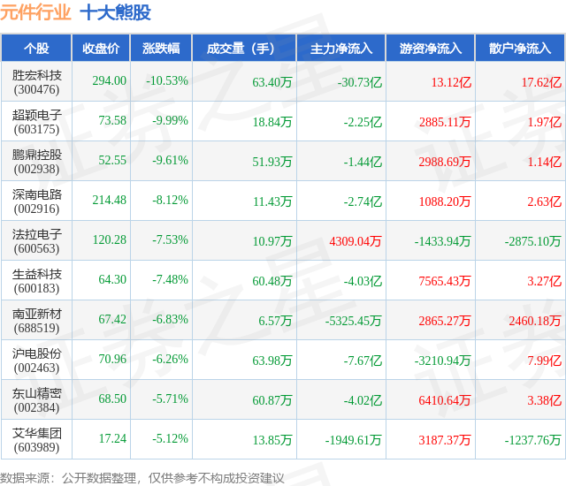个股表现方面,元件行业当日领跌股为胜宏科技(300476),该股当日报收294.0,下跌10.53%,成交量63.4万,主力资金净流出30.73亿元。超颖电子(603175)以下跌9.99%紧随其后,该股当日成交量18.84万,主力资金净流出2.25亿元。除此之外,鹏鼎控股(002938)、深南电路(002916)、法拉电子(600563)均进入当日熊股之列。具体个股列表见下表: