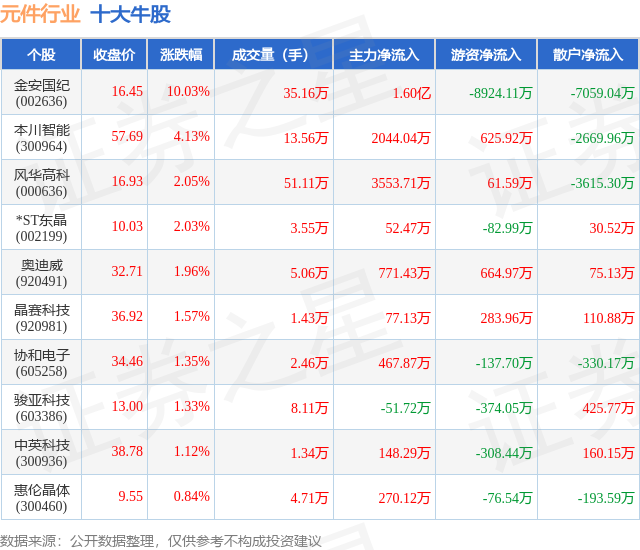 个股表现方面,元件行业当日领涨股为金安国纪(002636),该股当日报收16.45,上涨10.03%,成交量35.16万,主力资金净流入1.6亿元。本川智能(300964)以上涨4.13%紧随其后,该股当日成交量13.56万,主力资金净流入2044.04万元。除此之外,风华高科(000636)、*ST东晶(002199)、奥迪威(920491)均进入当日牛股之列。具体个股列表见下表: