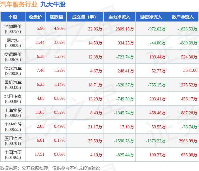 个股表现方面,汽车服务行业当日领涨股为浩物股份(000757),该股当日报收5.96,上涨4.93%,成交量32.06万,主力资金净流入2809.15万元。阿尔特(300825)以上涨3.62%紧随其后,该股当日成交量14.5万,主力资金净流入934.25万元。除此之外,交运股份(600676)、德众汽车(920030)、国机汽车(600335)均进入当日牛股之列。具体个股列表见下表:
