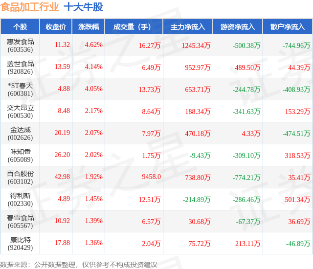 个股表现方面,食品加工行业当日领涨股为惠发食品(603536),该股当日报收11.32,上涨4.62%,成交量16.27万,主力资金净流入1245.34万元。盖世食品(920826)以上涨4.14%紧随其后,该股当日成交量6.49万,主力资金净流入952.97万元。除此之外,*ST春天(600381)、交大昂立(600530)、金达威(002626)均进入当日牛股之列。具体个股列表见下表: