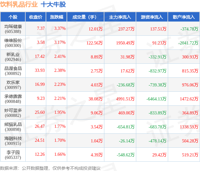 个股表现方面,饮料乳品行业当日领涨股为均瑶健康(605388),该股当日报收7.37,上涨3.37%,成交量12.01万,主力资金净流入237.27万元。维维股份(600300)以上涨3.17%紧随其后,该股当日成交量122.56万,主力资金净流入1950.49万元。除此之外,新乳业(002946)、品渥食品(300892)、欢乐家(300997)均进入当日牛股之列。具体个股列表见下表: