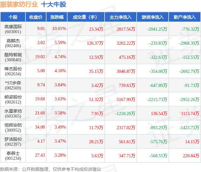 个股表现方面,服装家纺行业当日领涨股为奥康国际(603001),该股当日报收9.01,上涨10.01%,成交量23.34万,主力资金净流入2817.56万元。嘉麟杰(002486)以上涨5.59%紧随其后,该股当日成交量126.37万,主力资金净流入3202.22万元。除此之外,酷特智能(300840)、棒杰股份(002634)、*ST步森(002569)均进入当日牛股之列。具体个股列表见下表: