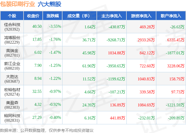 个股表现方面,包装印刷行业当日领跌股为佳合科技(920392),该股当日报收40.5,下跌3.55%,成交量1.64万,主力资金净流出430.87万元。鸿博股份(002229)以下跌1.76%紧随其后,该股当日成交量36.71万,主力资金净流出9268.71万元。除此之外,奥瑞金(002701)、紫江企业(600210)、大胜达(603687)均进入当日熊股之列。具体个股列表见下表: