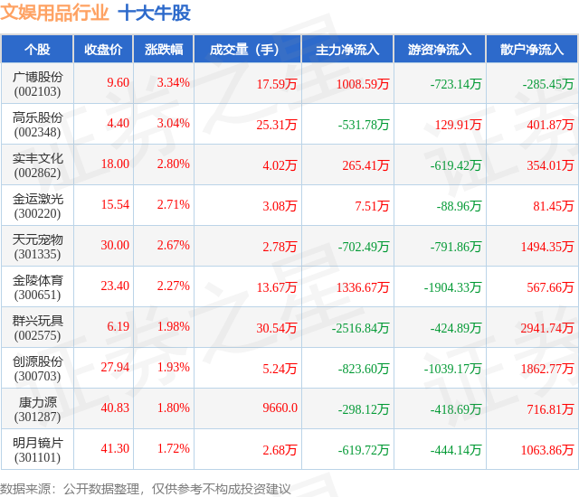个股表现方面,文娱用品行业当日领涨股为广博股份(002103),该股当日报收9.6,上涨3.34%,成交量17.59万,主力资金净流入1008.59万元。高乐股份(002348)以上涨3.04%紧随其后,该股当日成交量25.31万,主力资金净流出531.78万元。除此之外,实丰文化(002862)、金运激光(300220)、天元宠物(301335)均进入当日牛股之列。具体个股列表见下表: