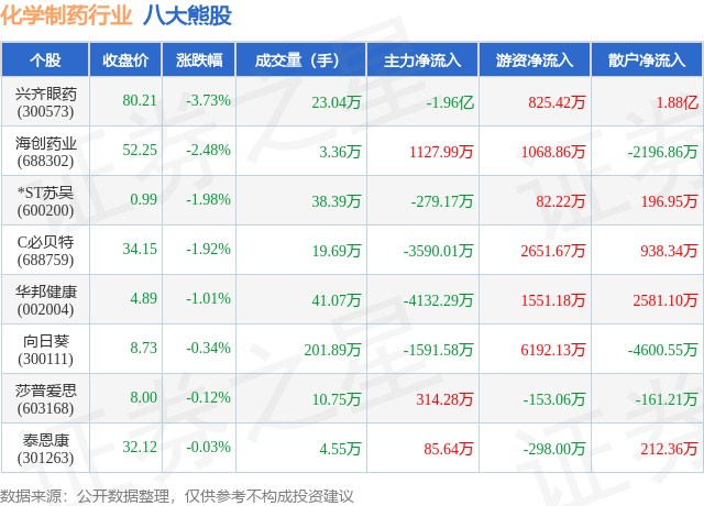 个股表现方面,化学制药行业当日领跌股为兴齐眼药(300573),该股当日报收80.21,下跌3.73%,成交量23.04万,主力资金净流出1.96亿元。海创药业(688302)以下跌2.48%紧随其后,该股当日成交量3.36万,主力资金净流入1127.99万元。除此之外,*ST苏吴(600200)、C必贝特(688759)、华邦健康(002004)均进入当日熊股之列。具体个股列表见下表: