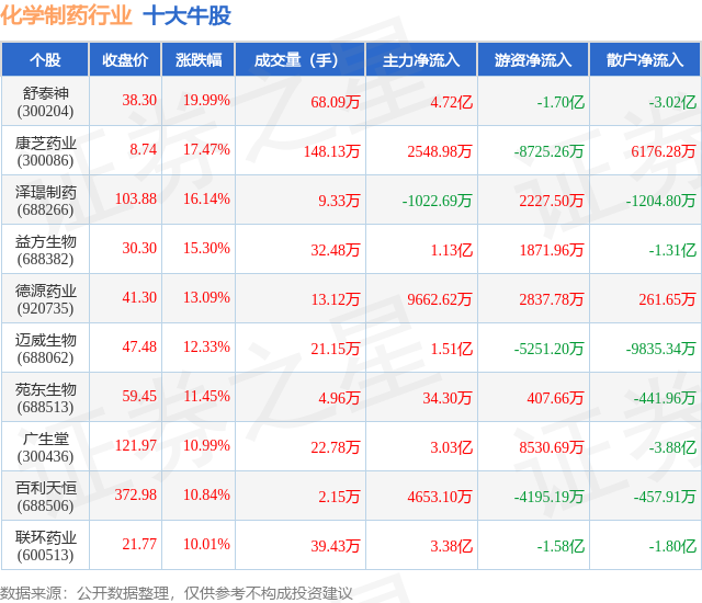 个股表现方面,化学制药行业当日领涨股为舒泰神(300204),该股当日报收38.3,上涨19.99%,成交量68.09万,主力资金净流入4.72亿元。康芝药业(300086)以上涨17.47%紧随其后,该股当日成交量148.13万,主力资金净流入2548.98万元。除此之外,泽璟制药(688266)、益方生物(688382)、德源药业(920735)均进入当日牛股之列。具体个股列表见下表: