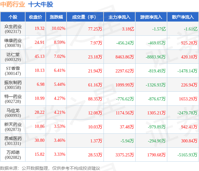 个股表现方面,中药行业当日领涨股为众生药业(002317),该股当日报收19.32,上涨10.02%,成交量77.25万,主力资金净流入3.18亿元。维康药业(300878)以上涨8.59%紧随其后,该股当日成交量7.97万,主力资金净流出456.24万元。除此之外,达仁堂(600329)、ST香雪(300147)、振东制药(300158)均进入当日牛股之列。具体个股列表见下表: