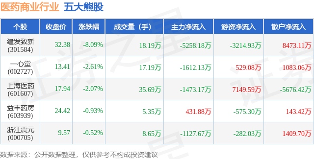个股表现方面,医药商业行业当日领跌股为建发致新(301584),该股当日报收32.38,下跌8.09%,成交量18.19万,主力资金净流出5258.18万元。一心堂(002727)以下跌2.61%紧随其后,该股当日成交量17.19万,主力资金净流出1612.13万元。除此之外,上海医药(601607)、益丰药房(603939)、浙江震元(000705)均进入当日熊股之列。具体个股列表见下表: