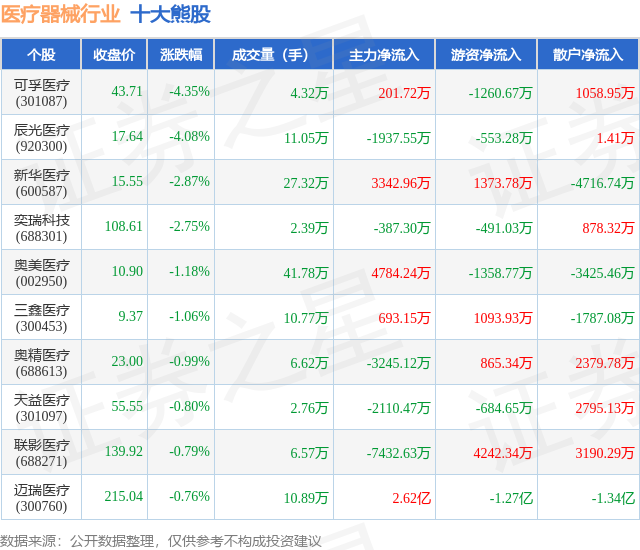 个股表现方面,医疗器械行业当日领跌股为可孚医疗(301087),该股当日报收43.71,下跌4.35%,成交量4.32万,主力资金净流入201.72万元。辰光医疗(920300)以下跌4.08%紧随其后,该股当日成交量11.05万,主力资金净流出1937.55万元。除此之外,新华医疗(600587)、奕瑞科技(688301)、奥美医疗(002950)均进入当日熊股之列。具体个股列表见下表: