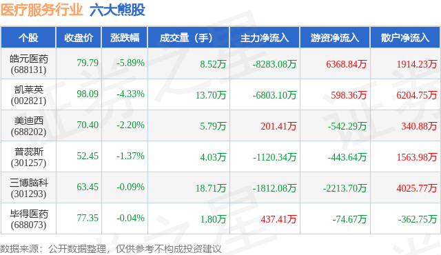 个股表现方面,医疗服务行业当日领跌股为皓元医药(688131),该股当日报收79.79,下跌5.89%,成交量8.52万,主力资金净流出8283.08万元。凯莱英(002821)以下跌4.33%紧随其后,该股当日成交量13.7万,主力资金净流出6803.1万元。除此之外,美迪西(688202)、普蕊斯(301257)、三博脑科(301293)均进入当日熊股之列。具体个股列表见下表: