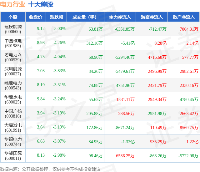 个股表现方面,电力行业当日领跌股为建投能源(000600),该股当日报收9.12,下跌5.0%,成交量63.81万,主力资金净流出6351.85万元。中国核电(601985)以下跌4.26%紧随其后,该股当日成交量312.16万,主力资金净流出5.41亿元。除此之外,粤电力A(000539)、深圳能源(000027)、皖能电力(000543)均进入当日熊股之列。具体个股列表见下表: