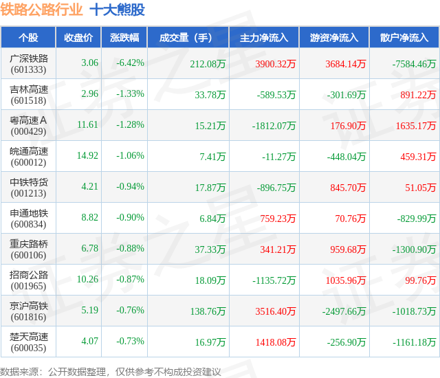 个股表现方面,铁路公路行业当日领跌股为广深铁路(601333),该股当日报收3.06,下跌6.42%,成交量212.08万,主力资金净流入3900.32万元。吉林高速(601518)以下跌1.33%紧随其后,该股当日成交量33.78万,主力资金净流出589.53万元。除此之外,粤高速A(000429)、皖通高速(600012)、中铁特货(001213)均进入当日熊股之列。具体个股列表见下表: