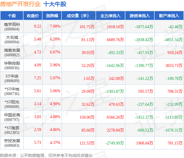 个股表现方面,房地产开发行业当日领涨股为南京高科(600064),该股当日报收9.22,上涨7.08%,成交量101.75万,主力资金净流入1918.1万元。大名城(600094)以上涨6.2%紧随其后,该股当日成交量81.13万,主力资金净流入6689.76万元。除此之外,海泰发展(600082)、华联控股(000036)、ST中迪(000609)均进入当日牛股之列。具体个股列表见下表: