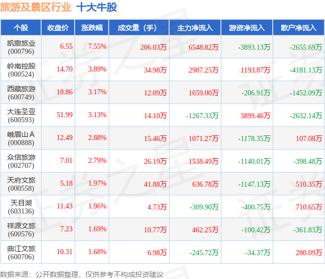 个股表现方面,旅游及景区行业当日领涨股为凯撒旅业(000796),该股当日报收6.55,上涨7.55%,成交量206.03万,主力资金净流入6548.82万元。岭南控股(000524)以上涨3.89%紧随其后,该股当日成交量34.98万,主力资金净流入2987.25万元。除此之外,西藏旅游(600749)、大连圣亚(600593)、峨眉山A(000888)均进入当日牛股之列。具体个股列表见下表: