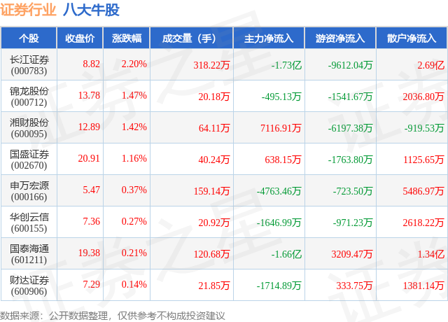 个股表现方面,证券行业当日领涨股为长江证券(000783),该股当日报收8.82,上涨2.2%,成交量318.22万,主力资金净流出1.73亿元。锦龙股份(000712)以上涨1.47%紧随其后,该股当日成交量20.18万,主力资金净流出495.13万元。除此之外,湘财股份(600095)、国盛证券(002670)、申万宏源(000166)均进入当日牛股之列。具体个股列表见下表: