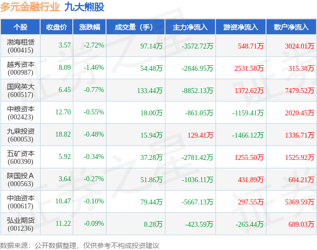 个股表现方面,多元金融行业当日领跌股为渤海租赁(000415),该股当日报收3.57,下跌2.72%,成交量97.14万,主力资金净流出3572.72万元。越秀资本(000987)以下跌1.46%紧随其后,该股当日成交量54.48万,主力资金净流出2846.95万元。除此之外,国网英大(600517)、中粮资本(002423)、九鼎投资(600053)均进入当日熊股之列。具体个股列表见下表: