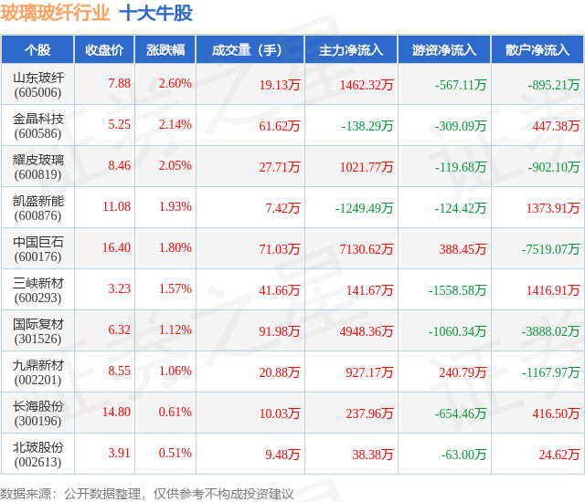 个股表现方面,玻璃玻纤行业当日领涨股为山东玻纤(605006),该股当日报收7.88,上涨2.6%,成交量19.13万,主力资金净流入1462.32万元。金晶科技(600586)以上涨2.14%紧随其后,该股当日成交量61.62万,主力资金净流出138.29万元。除此之外,耀皮玻璃(600819)、凯盛新能(600876)、中国巨石(600176)均进入当日牛股之列。具体个股列表见下表:
