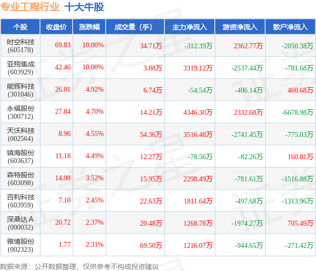 个股表现方面,专业工程行业当日领涨股为时空科技(605178),该股当日报收69.83,上涨10.0%,成交量34.71万,主力资金净流出312.39万元。亚翔集成(603929)以上涨10.0%紧随其后,该股当日成交量3.88万,主力资金净流入3319.12万元。除此之外,能辉科技(301046)、永福股份(300712)、天沃科技(002564)均进入当日牛股之列。具体个股列表见下表: